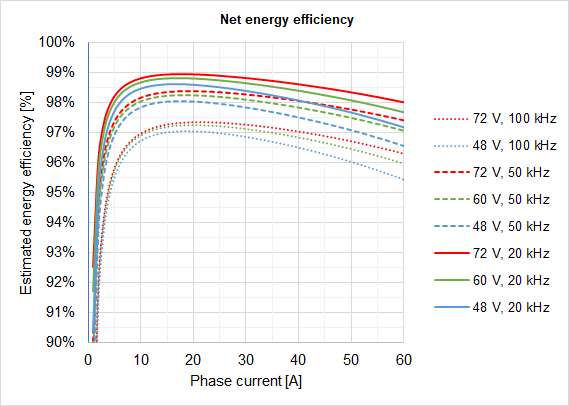 The following graph shows the electrical energy efficiency including logic for various operation points assuming 50 ºC case temperature and the drive delivering the maximum output power (i.e. maximum output voltage and motor speed). As seen, very high efficiencies > 99% can be achieved at 10 kHz or 20 kHz PWM frequencies.