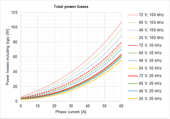 Following figure show the total power losses at different operating points. This includes logic supply and considers a single supply scenario. As can be seen, lower PWM frequency and voltage leads to lower power losses.