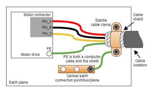 Switching noise by the phases is coupled to earth through the housing of the motor. This high-frequency noise creates a common mode current loop between drive and motor. Although the motor housing is connected to earth through the system chassis, its electrical connection may have a relatively high impedance and present a big loop. For this reason, is essential to reduce the common-mode current return path impedance and its loop area.