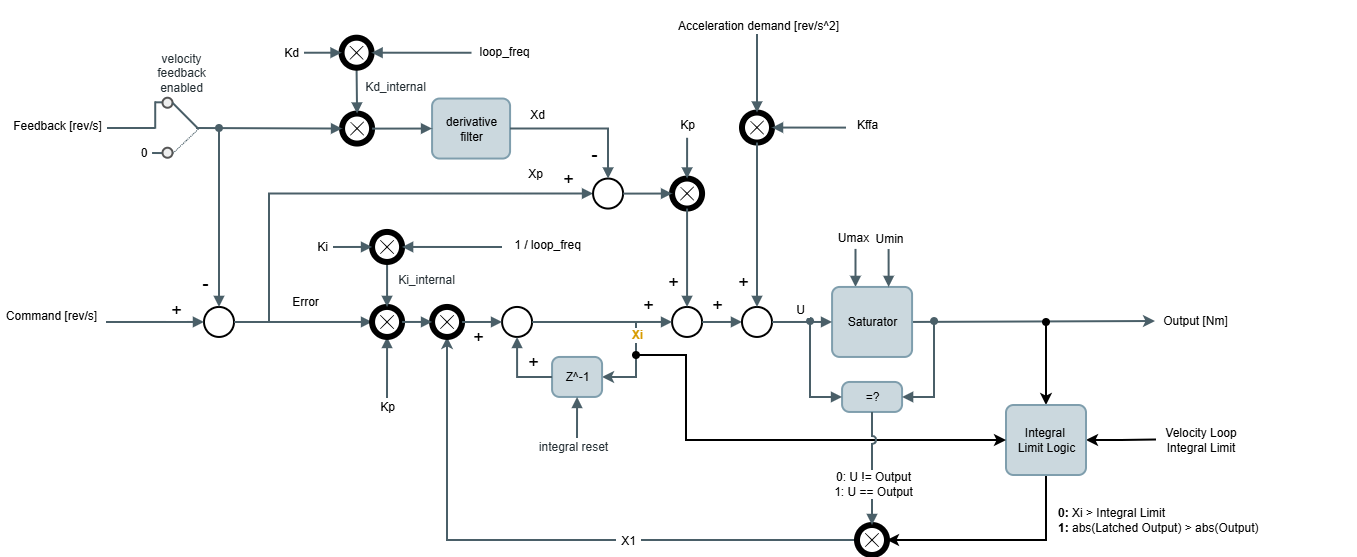 Kp, Ki and Kd are the PID gains. Kp in [Nm/(rev/s)], Ki in [Hz] and Kd in [s2].