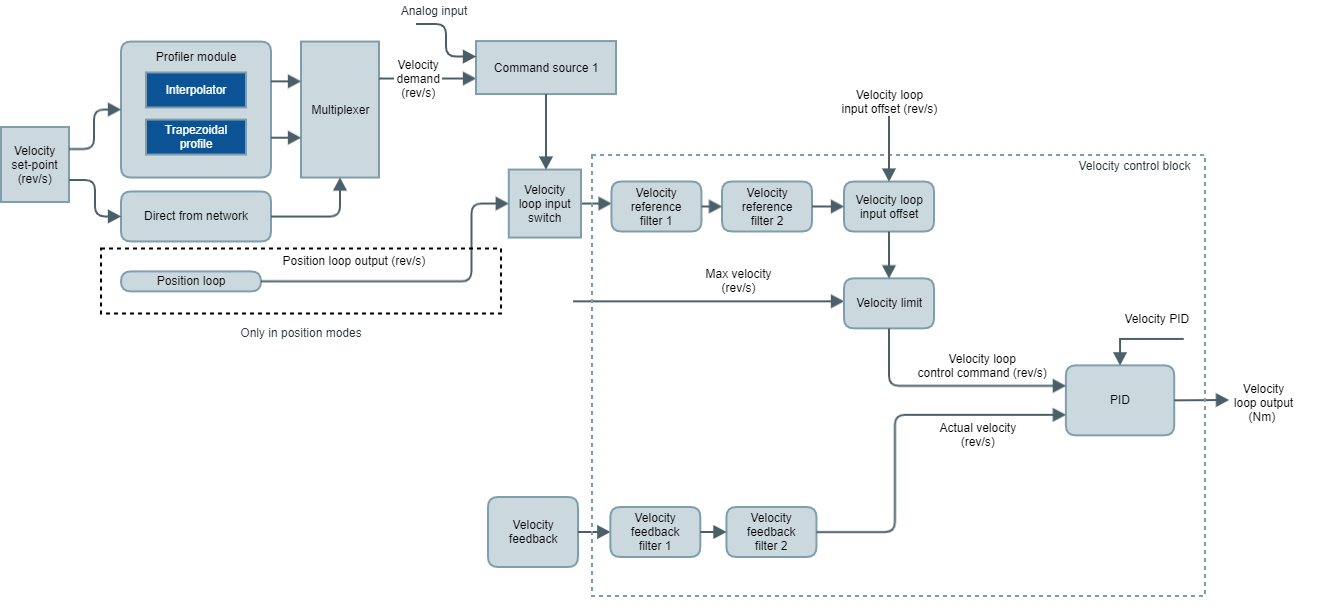 Velocity (V) mode uses the above control scheme, connecting the velocity set-point input from the application directly to the Velocity demand signal mentioned above.