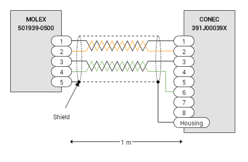 The EtherCAT Communication Cable is provided with a length of 1 m. It consists of a CAT6 (28 AWG - twisted pair & shielded) cable with a shielded RJ45 connector on one side and a 5-pin Molex Pico-clasp on the other. Molex Pico-clasp connector should be plugged directly into the XCR J4 connector.
