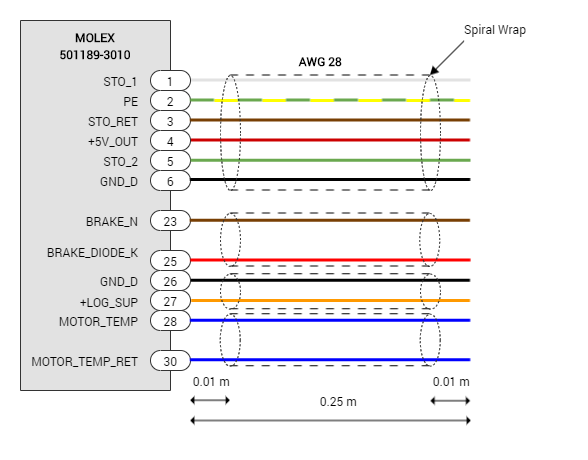| 3 | Flying lead | Brown | 6820 BR005 | STO_RET | Safe Torque Off common (optocoupler LEDs cathode, ISOLATED). |