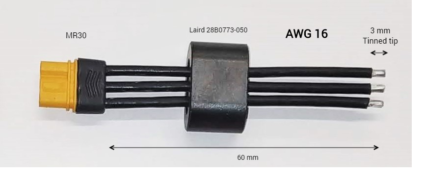 The Motor Power cable is provided with a length of 60 mm. It consists of three AWG16 - 1.5 mm2 cables with an MR30 female connector from AMASS on one side and flying leads on the other. A common mode choke model Laird 28B0773-050 is provided to simplify the installation where electromagnetic compatibility is needed. Flying leads should be soldered properly into the XCR P2 connector. Please, follow indications provided in the 'Soldering Power Pins' section in the product manual for your specific drive type for a proper assembly.