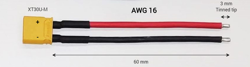 The Power Supply cable is provided with a length of 60 mm. It consists of two AWG16 - 1.5 mm2 cables with an XT30U-M male connector from AMASS on one side and flying leads on the other side.