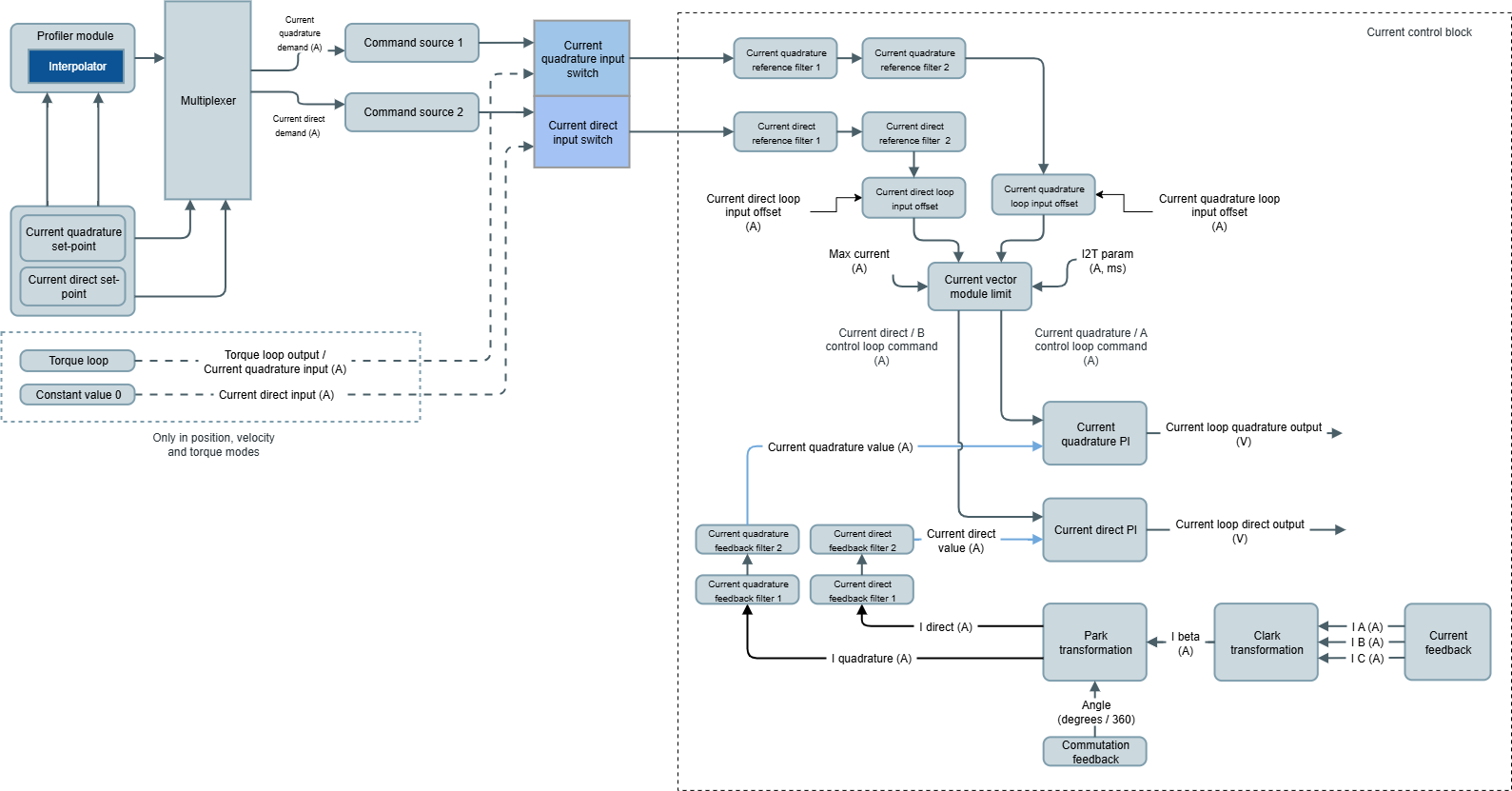 When the commutation modulation type parameter is set to Brushless DC or Brushed DC, only the current quadrature control is used. However, both of the current inputs (direct and quadrature) are still used for processing some protections (I2T, derating). In this case, make sure the current direct set-point and current direct loop input offset are set to 0