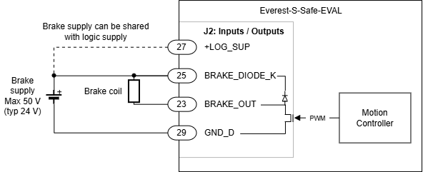 Electromechanical brakes are needed in critical applications where the disconnection of the motor or a lack of electric braking could be dangerous or harmful (i.e. falling suspended loads). Everest S Safe EVAL Servo Drive includes a brake output on the I/O connector J2. The brake output is an N-Channel MOSFET that can be PWM modulated to reduce effective brake voltage and thus power consumption when energized.