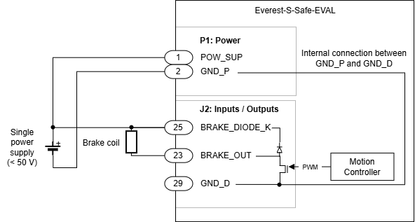 The next figure shows the connection with a single power supply (< 50V systems). Note that it is possible to operate a 24 V brake with a 48 V power supply by configuring the maximum PWM duty cycle of the brake to 50%. In this case, configure it carefully before physically connecting the brake.