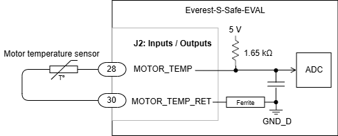 The Everest S Safe EVAL motor safety system connector allows the connection of an external temperature sensor based on changes of resistance (PTC thermistor, bimetal, NTC, PT100, silicon temperature sensors) to measure the motor temperature. The motion controller includes linearization for various sensors so the motor temperature can be read directly. Connection of the 2 wire sensors is shown next: