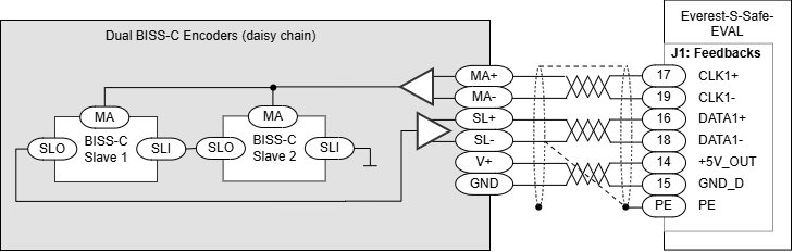 For dual daisy-chain BISS-C use the following connection. Dual BISS-C can be used for redundancy or to read the position of the rotor before and after a gearbox. Further details on this interface can be found here Primary Absolute Slave 2 (daisy chain).