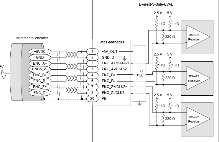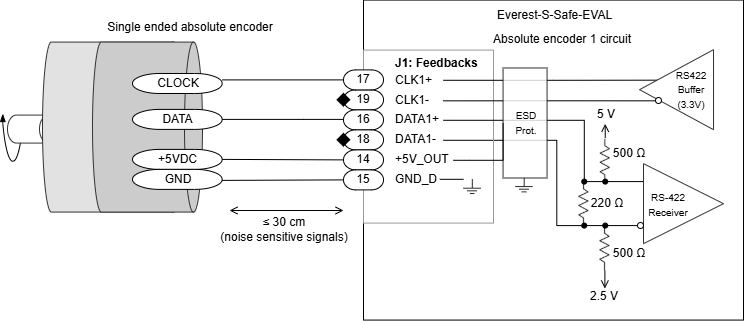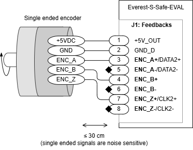 The wiring of a single-ended encoder to the Everest S Safe EVAL is shown next: