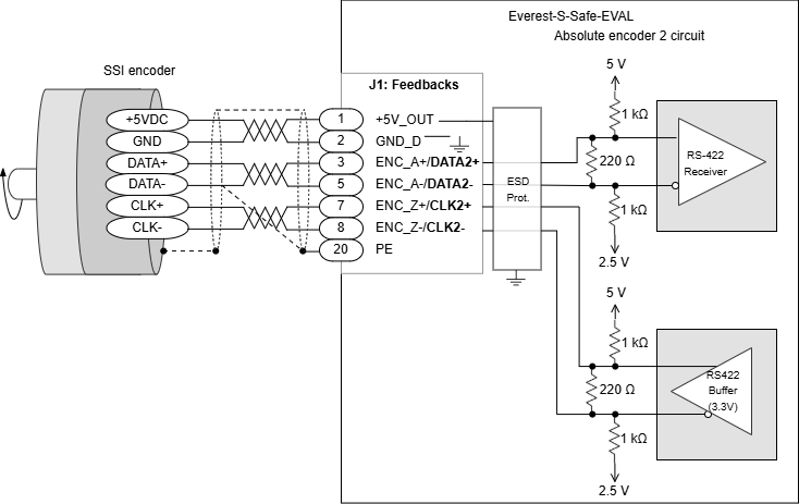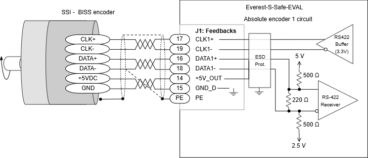 Next Figure shows how to connect a single SSI or BISS-C absolute encoder to the Everest S Safe EVAL servo drive.