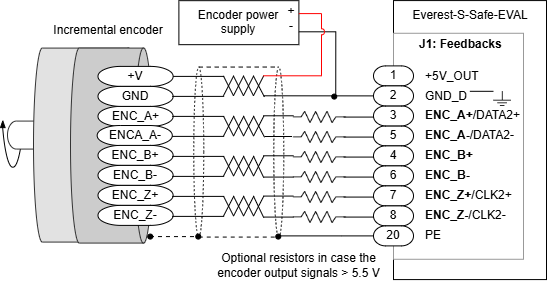 In the case that the encoder has a current consumption higher than 200 mA (maximum current output of the +5V_OUT pin of the Everest S Safe EVAL) or that the encoder has an input supply > 5V, an external power supply will need to be used in order to power the encoder and in this case some wiring changes need to be taken into account (this applies to both the differential and single-ended encoders, both incremental and absolute):