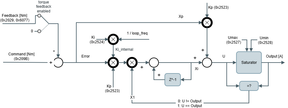 In some applications, the PI is not enough for proper control. In these cases, there is an additional input through the reference signal to the PI that is identified as Offset in the diagram. The purpose of this 0x2080 - Torque loop input offset/0x60B2 - Torque offset is to be used by an external master to compensate for the system dynamics based on information that cannot be read directly by the drive.