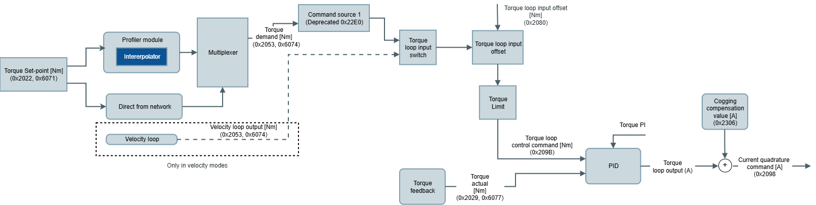 0x2022 - Torque set-point, 0x6071 - Target torque is the target commanded to the torque modes of operation.