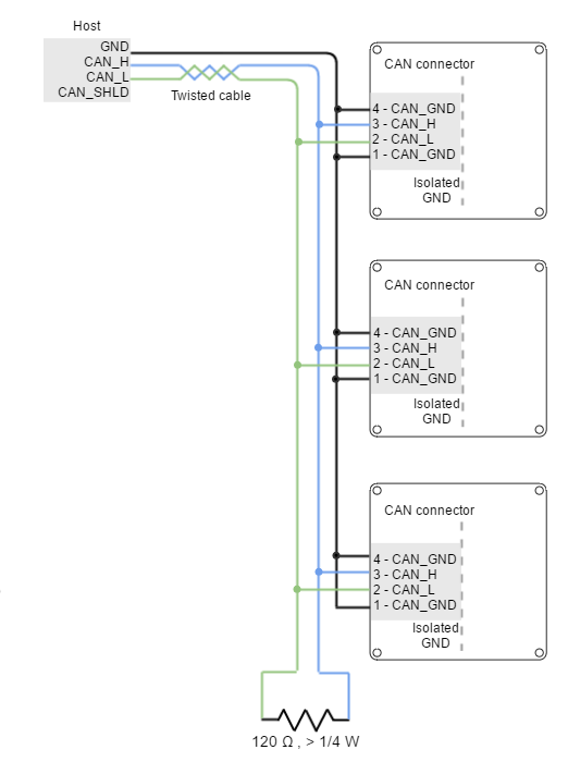 - Build CAN network using cables with 2-pairs of twisted wires (2 wires/pair) as follows: one pair for CAN_H with CAN_L and the other pair for CAN_V+ with CAN_GND.