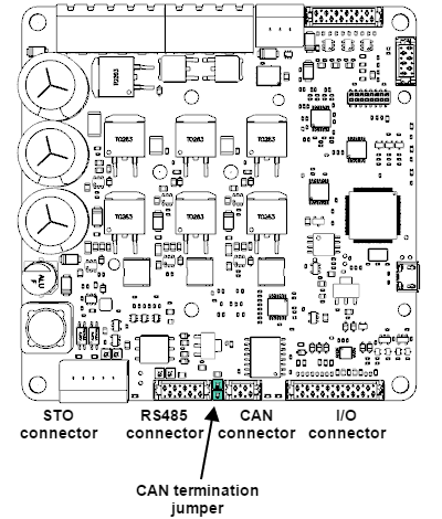 Jupiter Servo Drive includes a termination resistor on board. A jumper placed next to the CAN connector allows the user to terminate the bus with a 120 Ω resistor. Use a standard 2.54 mm pitch jumper for this purpose.