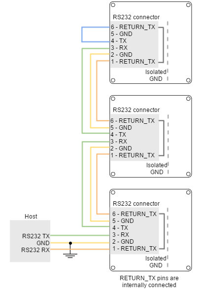 Daisy chain connection is a multi-point network topology based on connecting multiple terminals in a ring. The wiring consists on connecting the TX terminal of each device to the RX terminal of the next device. With the use of RETURN_TX terminal (which directly connects terminals 1 and 6) daisy chain wiring can be simplified. An example of RS232 daisy chain wiring is shown in the next figure.
