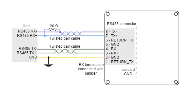 The use of termination resistors at the RX side of each differential pair (120 Ω between RX+ and RX- of both host and slave) is essential for correct operation of the RS485 communication. For long cable distances (> 10 m) a termination in the TX side is also recommended.