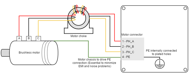 Brushless motors should be connected to phase A, B and C terminals. Note that some manufacturers may use different phase name conventions (see Table below). Motor wiring is an important contributing factor to Electromagnetic Interferences, please check this document regarding Electromagnetic Compatibility in servo drives Electromagnetic Interference Issues With Servo Drive Systems.