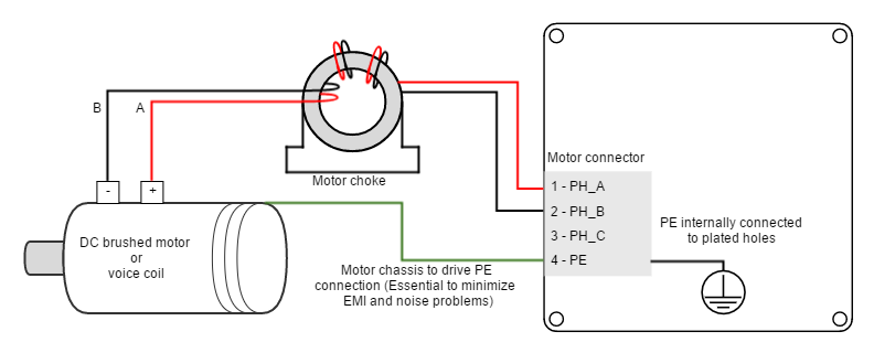 In order to minimize the capacitive coupling of the motor wires, and therefore cancelling the effect of the common mode rejection effect, the choke has to be properly wired.