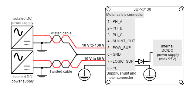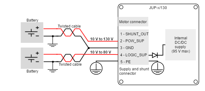 - Jupiter versions JUP-15/130 and JUP-30/130 support +10 V to +90 V in the LOGIC_SUP input, and +10 V to +130 V in the POW_SUP input. In the 130V version the bypass diode from DC bus is not mounted.