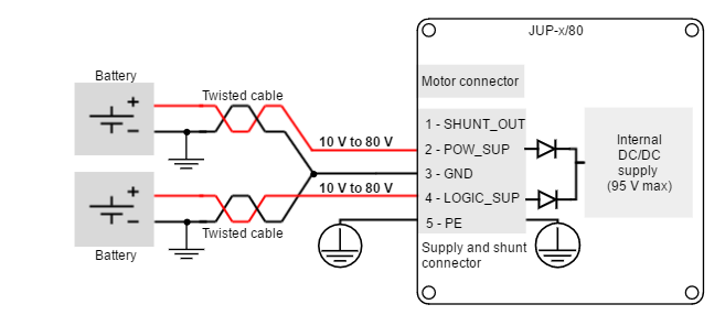 The following pictures show the Jupiter versions JUP-20/80 and JUP-40/80 supply wiring diagrams. These versions can be supplied using only the POW_SUP input or using separated power supplies for POW_SUP and LOGIC_SUP. This method is interesting to avoid loosing communication with the Jupiter in case of POW_SUP failure.