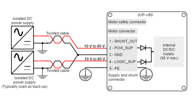 In Jupiter versions JUP-20/80 and JUP-40/80, if POW_SUP voltage is higher than LOGIC_SUP voltage, the logic circuitry is powered from the POW_SUP supply. An internal diode connects the DC bus with the logic supply.
