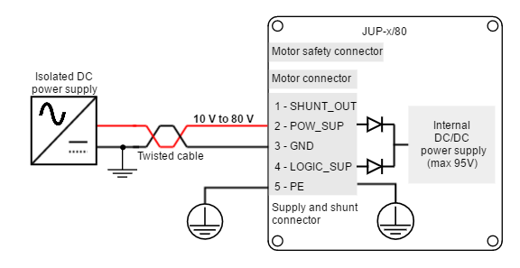 Low current versions of Jupiter Servo Drive (JUP-20/80-y and JUP-15/130-y) are supplied from the Supply and shunt connector. High current versions of Jupiter (JUP-40/80-y and JUP-30/130-y) are supplied from the the Supply, shunt and motor connector. Both versions have separated supply inputs for the logic and the power stage. An internal DC/DC converter provides circuits with appropriate voltages as well as a regulated 5 V output voltage to supply feedback sensors and I/O.