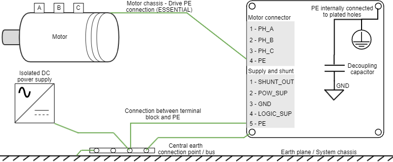 Connecting the drive PE terminals and cold plate screws to your system Earth and to the motor housing solves many noise and EMI problems. The PE drive terminals are decoupled to power ground through a safety capacitor. This provides a low impedance preferential path for coupled common-mode noises that otherwise would be coupled to sensitive electronics like the encoders. A good grounding of the drive to the earth of the power supply is also essential for a EMI reduction.