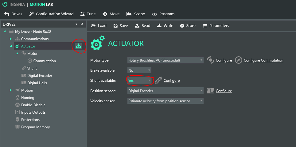 - In the actuator window, set Shunt Available to Yes and write the change to the driver.