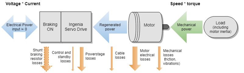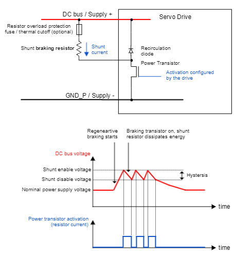 However, in regenerative mode the inertia of the load is driving the movement of the motor, not the servo drive, and thus the motor acts as a generator whose load is the servo drive and, ultimately, the DC bus supply. In the same way that the DC bus voltage is stepped-down in normal operation, the generated voltage is stepped-up in regenerative mode, which causes the DC bus voltage to increase as its capacitance is charged by the incoming current. Since this is usually a non-desired scenario, a shunt braking resistor can be connected to the servo drive to dissipate this excess of regenerated energy, preventing it to reach the DC bus.
