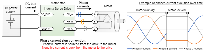 Because of this fact, at Ingenia manuals and documentation if not specified otherwise the current is expressed as the crest value of the phases. The software also shows either the instantaneous value for the individual phase currents or the computed "current actual value", which matches the crest positive value of the instantaneous currents. Further details on how the current is measured and controlled in Ingenia drives can be found in Current modes (CSC, C, CA).