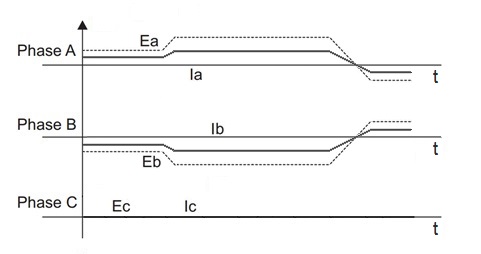 - Phase A and C sink I/2 negative. Example, phase A and C current are both -15 A.