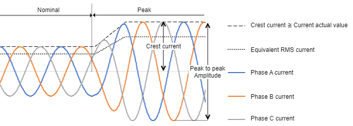 - Peak to peak amplitude (A): 2 times the crest value for a symmetrical current, corresponds to the peak to peak value of the signal.
