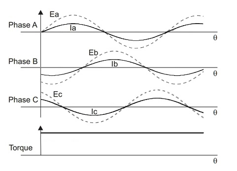 - Commutation is sinusoidal with the angle fixed at 120º (phase B is maximum positive). No electrical rotation.
