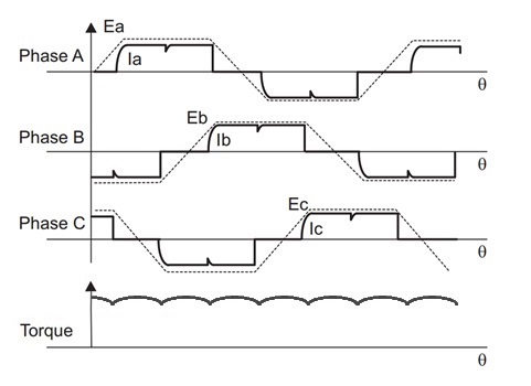 Trapezoidal modeIn trapezoidal mode, the motion controller modulates the voltage to fit the shape of a trapezoid. In this scenario, only 2 phases are active at the same time, matching the flat sections of the trapezoid, and the 3rd is left floating. Therefore, the current is positive in the phase modulated with positive voltage, it is negative in the phase modulated with negative voltage, and there is no current at all in the phase left floating, in which the observable voltage is the BEMF changing from positive to negative or vice-versa. The resulting torque shows a characteristic ripple, which is product of the fact that each 1/6th of the cycle a DC excitation is applied over a rotating magnetic field, so the resulting torque is proportional to the sine of the angle between the rotor and the excitation. As the current can be approximated to ideal square waves, the approximate RMS value of the current can be calculated as: IRMS = ICREST * √(2/3) With ICREST being the value of the current in DC during the flat section. In the diagram, the BEMF of each phase shown in dashed line. Torque and current in solid line. |