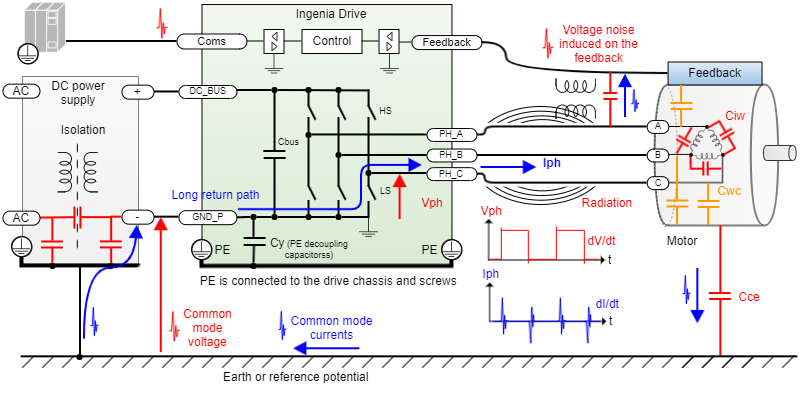 Note that many couplings do not necessarily occur on a single channel but as a combination of them. E.g. an inductive coupling from the motor cables to the encoder, being transferred via conductive coupling on the PCB to a communications port and then radiated through the communication cable.