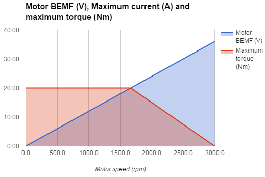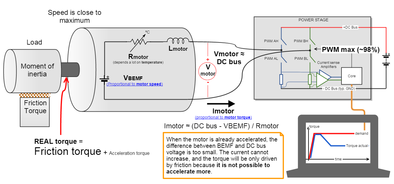 Sometimes after accelerating you can't reach the maximum torque. The reason is that no matter how much the current loop wants to increase current (proportional to torque) by increasing the PWM duty cycle of the power stage, the Vmotor is too close to Vbemf and therefore current can't increase more.
