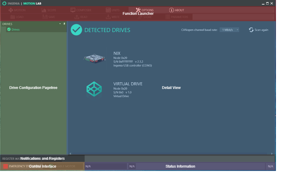 You configure and test your drive using various elements, such as panels, bars, and windows that conform the MotionLab interface. This interface is described in the following chapter.