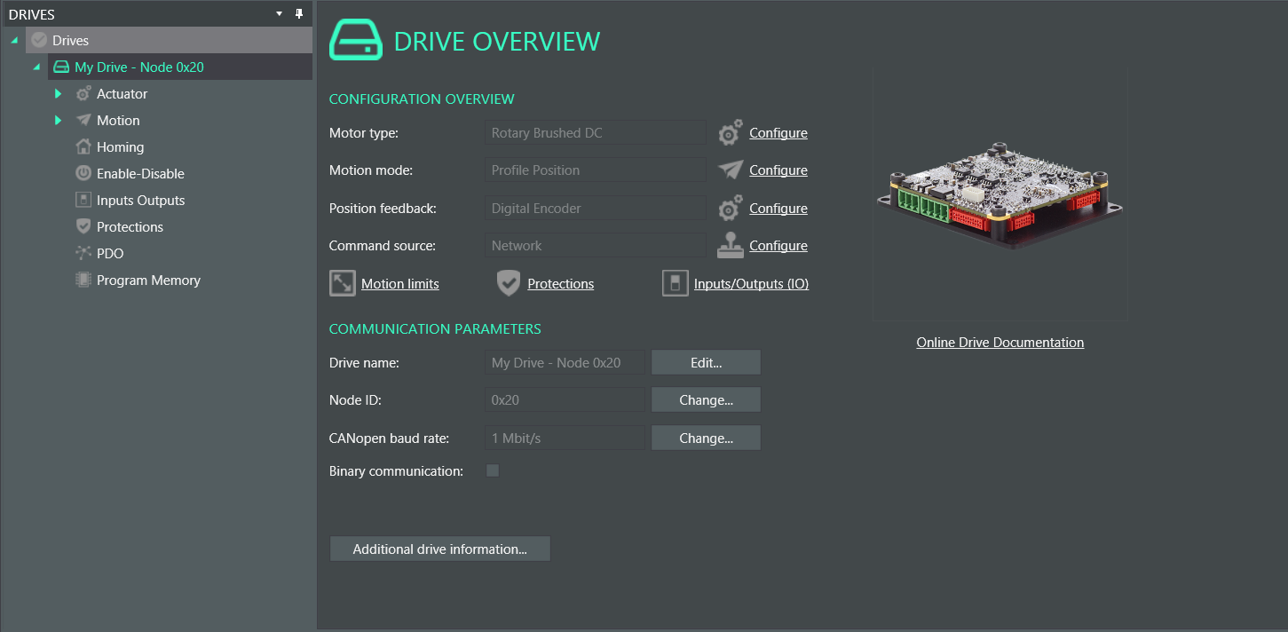 The detail view is the main interface for configuring your drive. By clicking on the Drive Configuration Pagetree the Detail View will show different options.