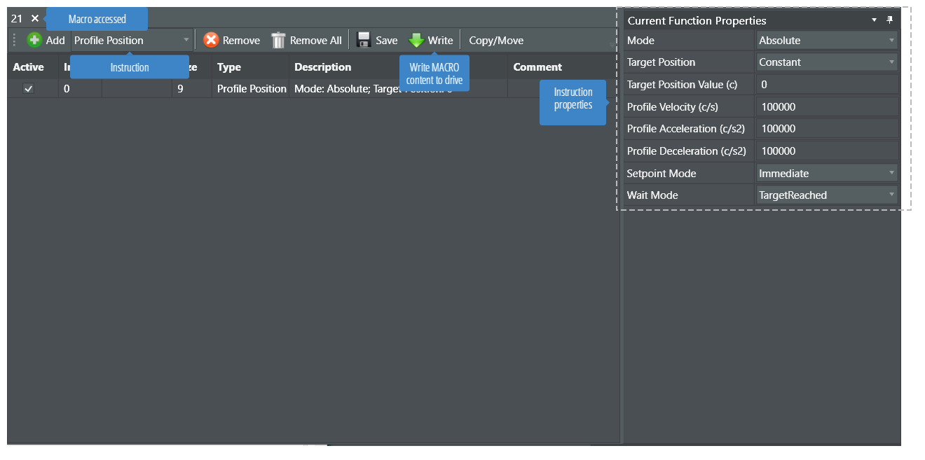 Programs, also called "macros", are created by one or more instructions that can combine moves, gain adjustments, timed delays, etc. Program instructions can also apply conditional logic and jumps, control the Servo Drive's digital outputs, and monitor the digital inputs. Several general purpose registers can also be used for user convenience.