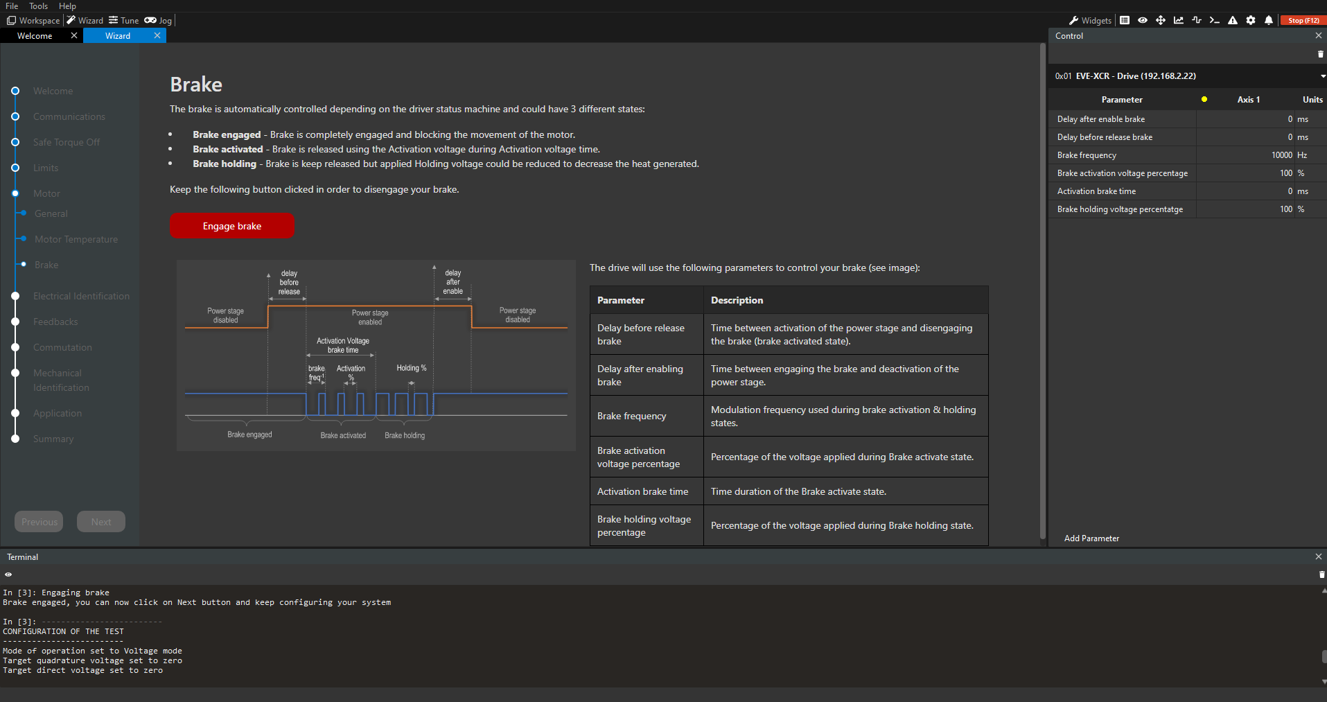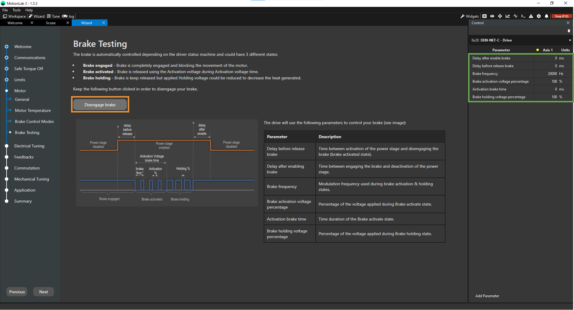 This step in the configuration Wizard is used to configure the activation/deactivation of the electromagnetic brake in your system. In order to do this, first you need to set the brake parameters properly in the Control widget (green square in the picture below) and then do the validation of these parameters Disengaging and Engaging again the brake (orange rectangle in the picture below):