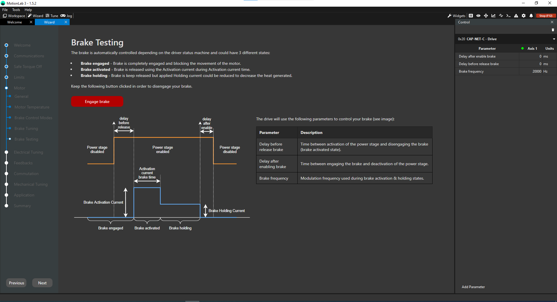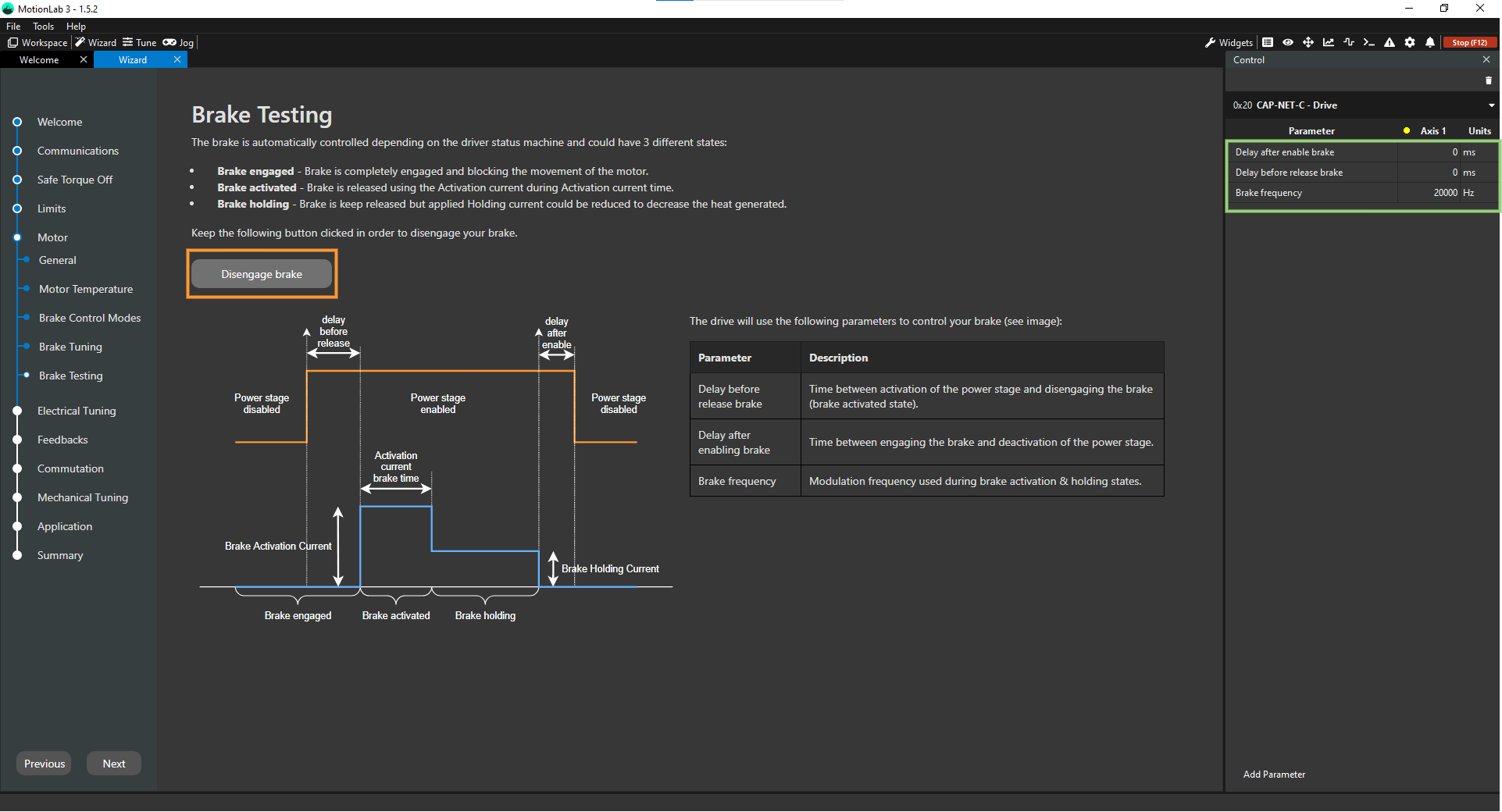 This step in the configuration Wizard is used to configure the activation/deactivation of the electromagnetic brake in your system. In order to do this, first you need to set the brake parameters properly in the Control widget (green square in the picture below) and then do the validation of these parameters Disengaging and Engaging again the brake (orange rectangle in the picture below):
