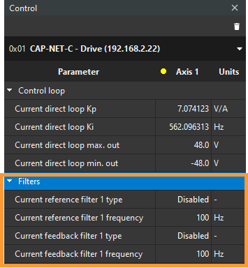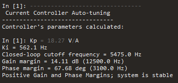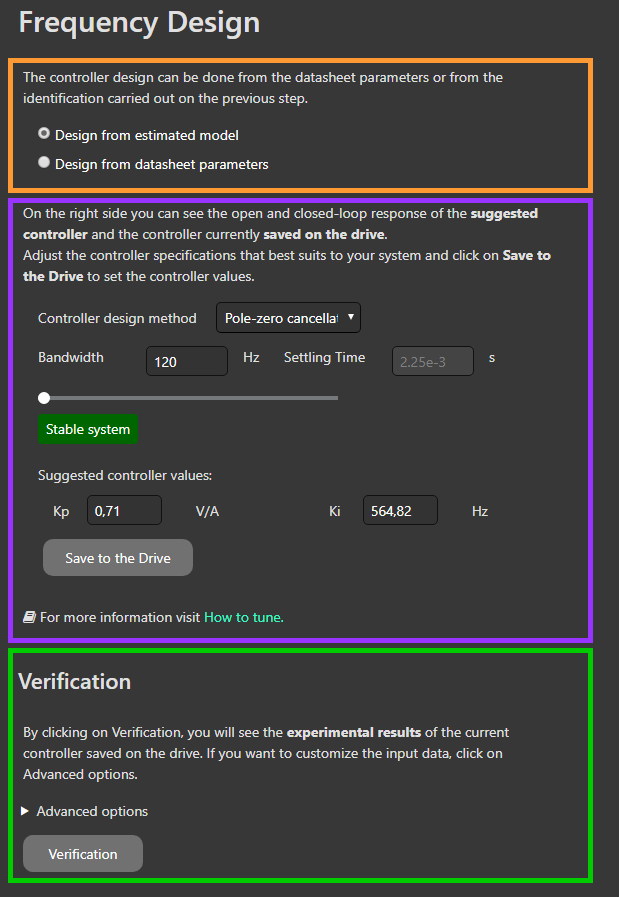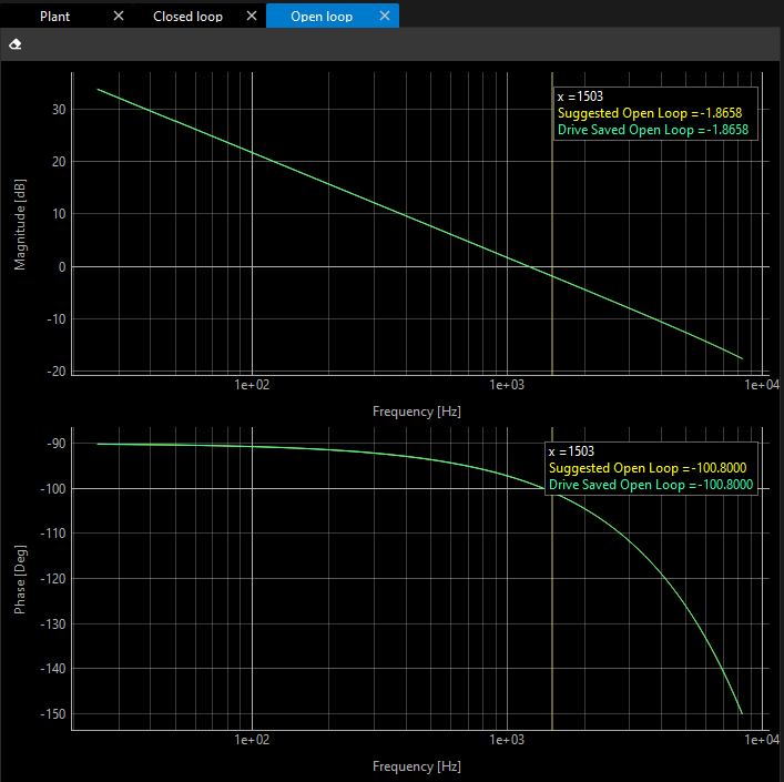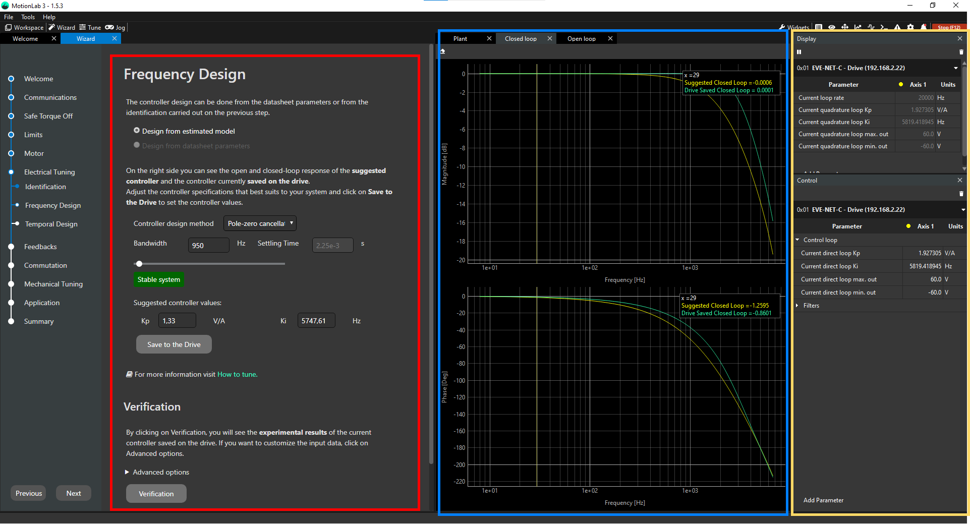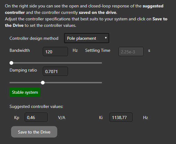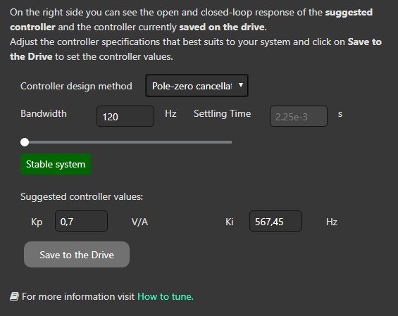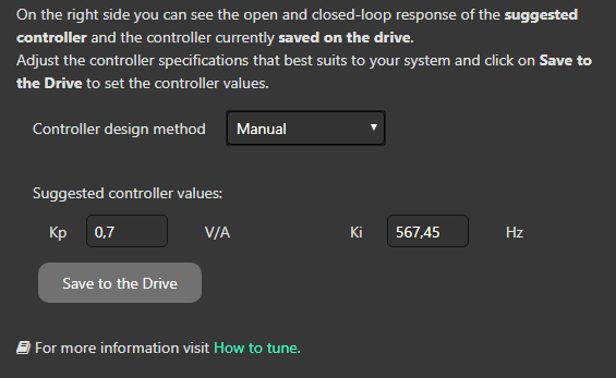 The main goal of this step is to adjust the loop parameters: Kp and Ki. You can get them and simulate their implications for the system without saving in the drive. You will be able to see these simulations in different plots.