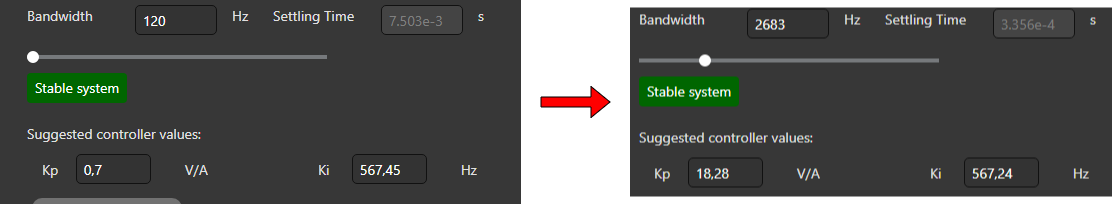 If you move the Bandwidth slider or directly you edit the its value directly, Kp and Ki parameters will be modified automatically.