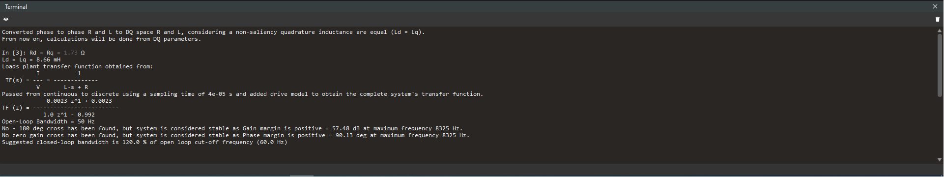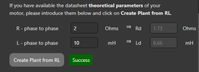 If the plant is created successfully, the equivalent resistance and inductance in the direct-quadrature frame values will be displayed.