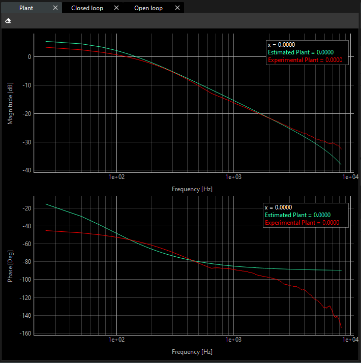 The green one is an estimated plant, and it is given by a transfer function calculation. This transfer function is calculated through resistance and inductance estimated.