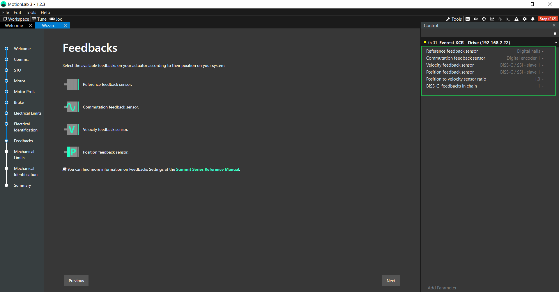 This step is used to assign the correct functionality for each one of the feedback sensors that you have wired to your drive. This is done by setting the parameters accordingly in the Control widget (green square below). For each different sensor that is selected for commutation/reference/velocity/position purposes, an additional step will be added in the Wizard in order to configure that particular sensor properly. This step is also used to configure gearbox ratios and dual BiSS-C encoders in daisy-chain connection.