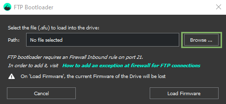 Before starting, please ensure that the Firewall allows the FTP connection. Otherwise, the process could fail and leave the drive in an unresponsive state. This unresponsive state can be overturned but it is simply better to not get there in the first place.